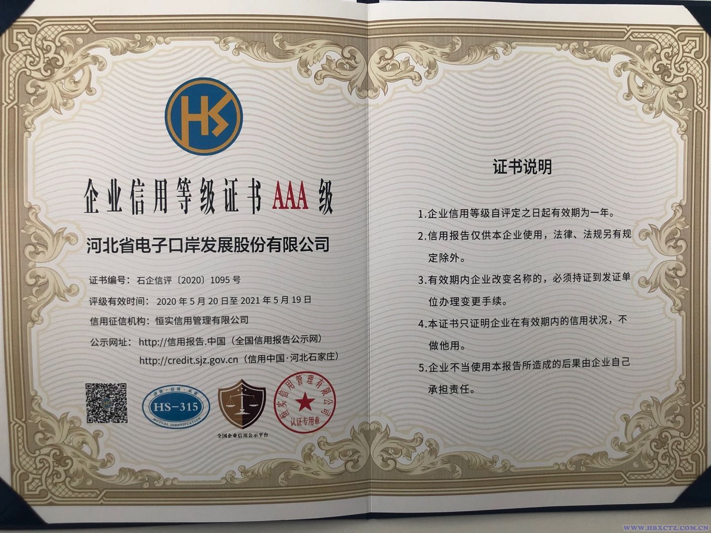 2020年5月,河北省電子口岸發展股份有限公司榮獲“企業信用等級證書AAA級”(最高級),并在全國信用報告公示網、信用中國·河北石家莊網站中公示。
