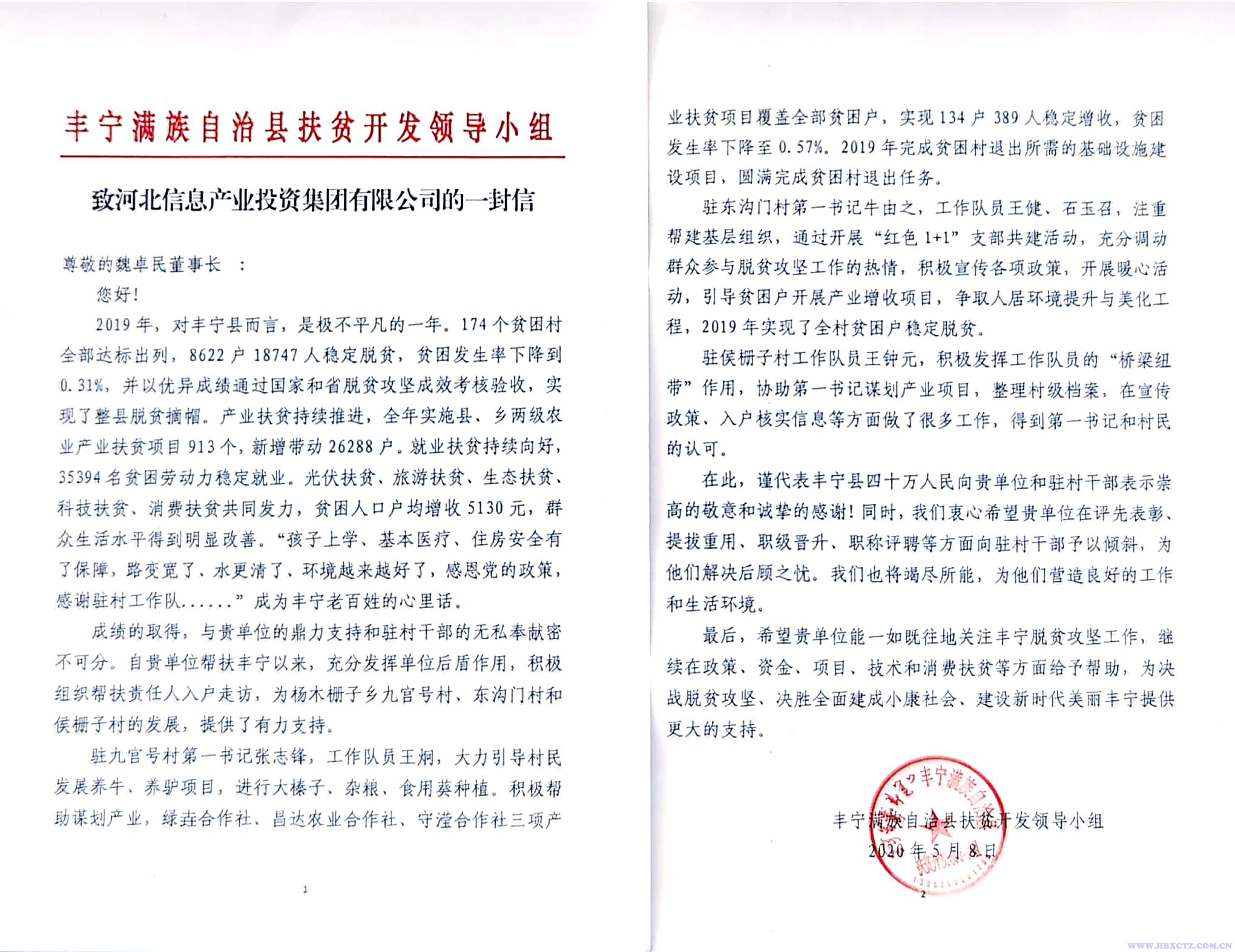 ?近日,豐寧縣委、縣政府給集團發(fā)來感謝信,對集團長期以來給予豐寧縣脫貧攻堅的大力支持和無私幫扶表示崇高的敬意和誠摯的感謝。