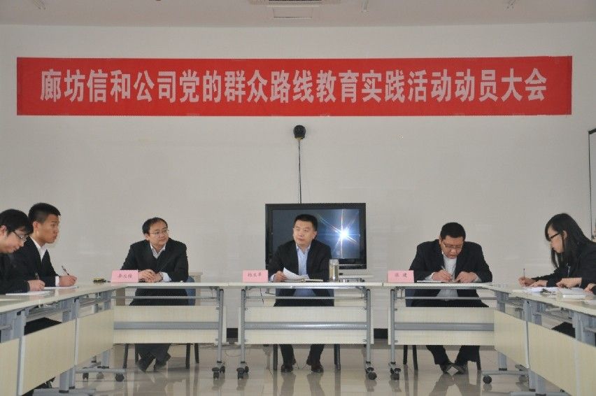會議由公司副總經理李慶佳主持,會上,公司副總經理張建宣讀了《廊坊信和軟件投資有限公司關于開展黨的群眾路線教育實踐活動實施方案》,董事長楊立卓傳達了中央、省委、省國資委文件精神及集團公司召開的黨的群眾路線教育實踐活動動員大會精神,并就集團公司活動要求做動員講話。楊立卓董事長首先深刻闡述了開展黨的群眾路線教育實踐活動的重要性、必要性和迫切性,要求全體職工必須高度重視此項活動開展,并結合廊坊公司現狀提出了具體要求:一是加強學習,學習中央、省委及省國資委和集團公司的文件精神;二是希望廣大員工對公司領導班子提出誠懇的意見和建議,共同完成好此次教育實踐活動;三是公司全體人員要以本次活動為契機,及時查擺工作中的突出問題,確保教育實踐活動取得實實在在的成效,服務于公司發展、服務于解決職工工作生活中的具體問題