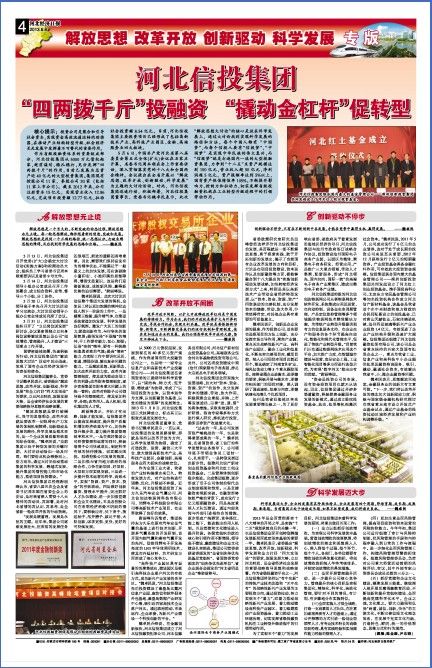 省委政策研究室研究員苗峰曾經這樣評價河北信投集團的發展,其歷程就是一部不斷解放思想、勇于探索實踐、敢于開拓創新的發展史,揭示了當前國有企業改革發展的方向和目標,無論是在項目投資建設、資本運作以及創新融資等方面,都能夠融合到十八大提出的“實施創新驅動發展戰略,加快轉變經濟發展方式”上來,特別是其以高新技術產業帶動全省經濟轉型發展,以“資本、資金、資源、資產”四資聯動的完善機制,充分發揮資本的鏈接、帶動、放大作用,非常值得肯定,對其他企業具有重要的可借鑒意義。