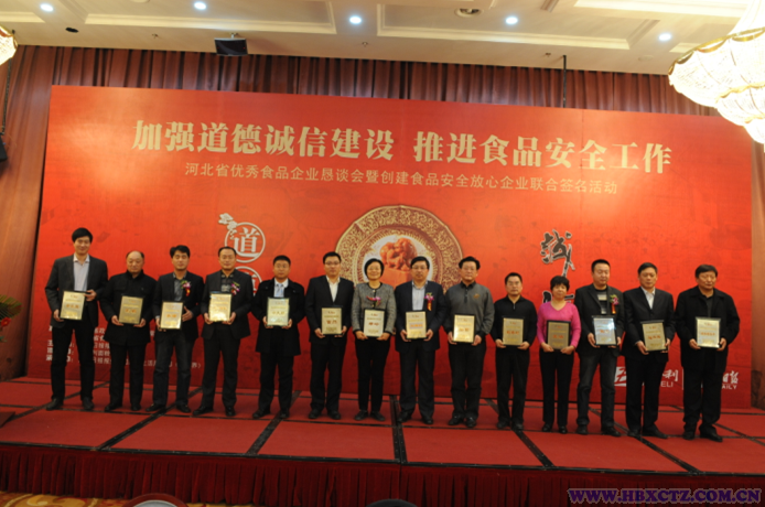 ??? ?2012年11月28日下午,“河北省知名食品企業(yè)懇談會暨創(chuàng)建食品安全放心企業(yè)聯(lián)合倡議”活動在石家莊神州七星大酒店舉行。越千年葡萄酒、老白干、五得利、露露等15家省內(nèi)知名食品企業(yè)被授予“品味2012—最受信賴的河北食品品牌”。